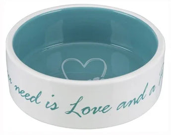 Vul deze voerbak met eten en jouw lieveling zal hem gretig leegeten. Op de voerbak staat in petrol kleurige letters de tekst "All you need is Love and a pet".