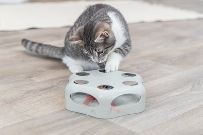 De Trixie Turning Feather Assorti is een interactief speeltje voor nieuwsgierige katten. De veer in het midden beweegt onvoorspelbaar heen en weer, stopt af en toe en verandert willekeurig van richting – perfect om het jachtinstinct van je kat te prikkelen. Het speeltje kan worden gevuld met kleine beloningssnoepjes voor extra motivatie. Dankzij de rubberen voetjes blijft het stevig staan tijdens het spelen. Na ongeveer 15 minuten schakelt het automatisch uit. Werkt op 3 AA-batterijen (niet inbegrepen).
