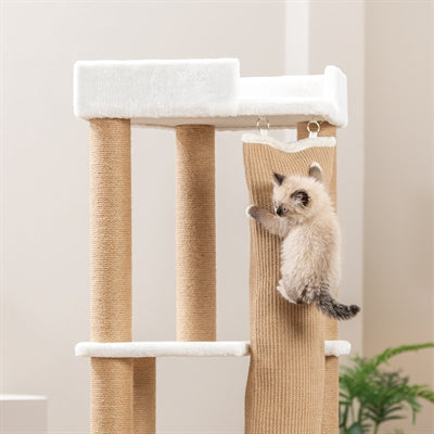 De Trixie Krabpaal Active Wit is een stevige en veelzijdige krabpaal die perfect is voor actieve katten. De paal is bekleed met jute van 5 mm dikte en zacht pluche van 400 g/m², waardoor je kat heerlijk kan krabben en spelen. Deze krabpaal heeft een grote klimzak van jute, een comfortabel mandje met een bekleed ligplateau en een gevoerde rand. Daarnaast biedt de schuilplaats binnenin een fijne plek om te rusten, bekleed met pluche en fleece voor extra comfort.